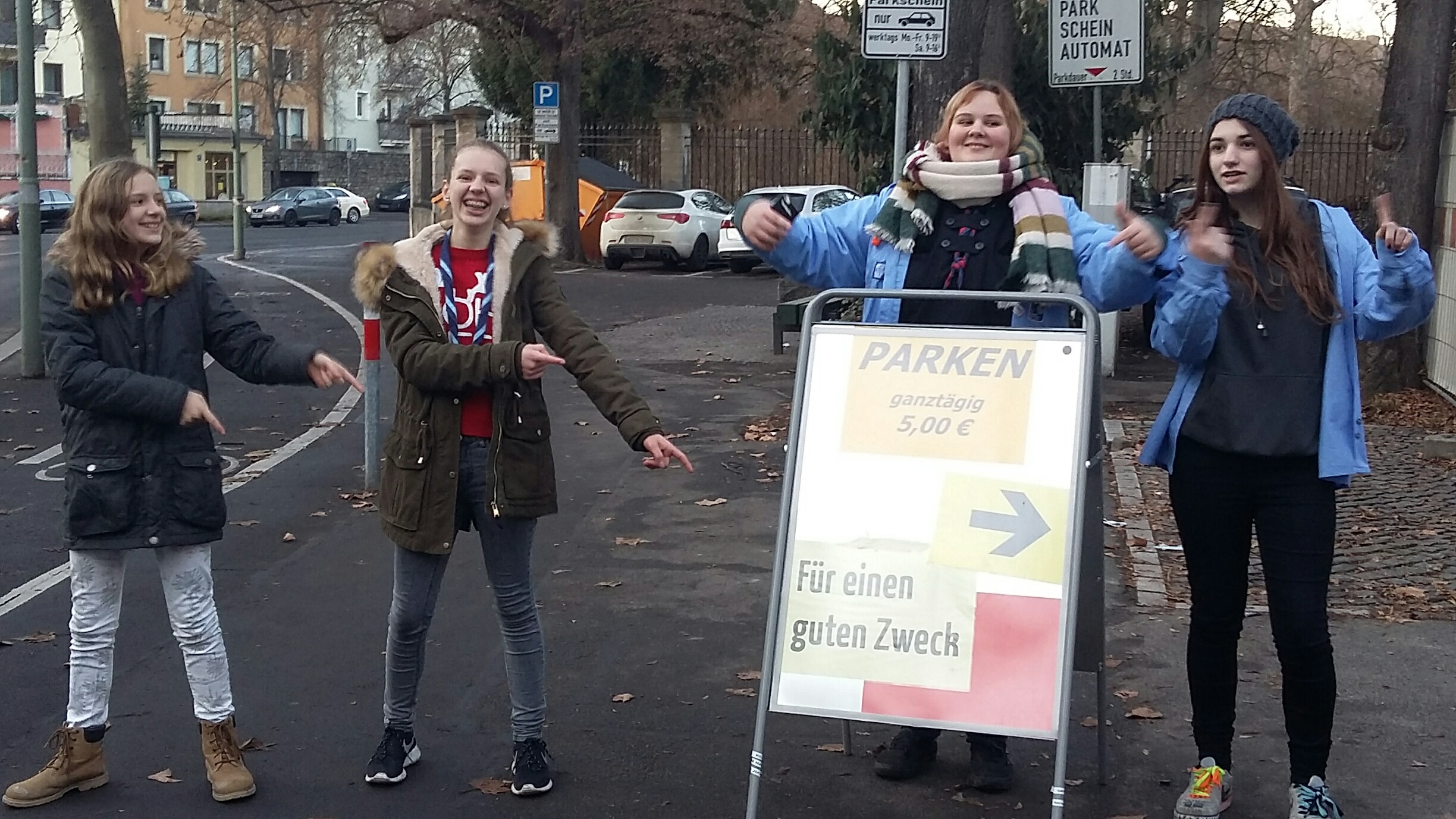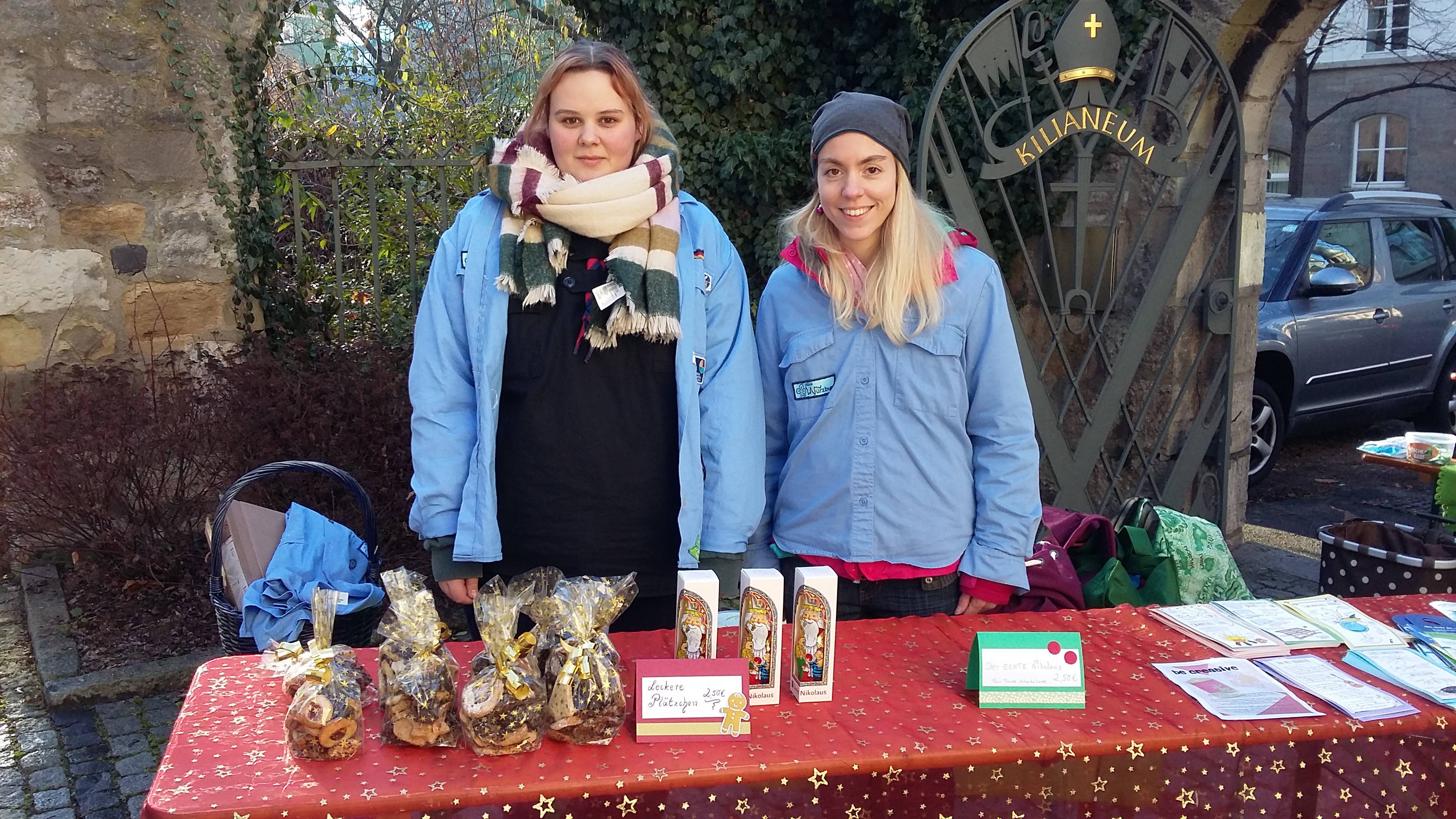 Trotz klirrender Kälte stellten sich unsere Mädels an den Samstagen des 3. und 4. Advents 2016 an den Parkplatz des Kilianeums. Der Parkplatz ist an den Adventsamstagen für alle offen. Jeder der den Tag über parken möchte, ist dazu eingeladen einen kleinen Obolus zu spenden. Mit viel heißem Tee und warmen Klamotten hielten die Mädels lange aus und konnten dank der netten Autofahrer knapp 718 Euro sammeln. Auch selbstgebackene Plätzchen und „Fair Trade Schoko-Nikoläuse“ wurden angeboten, so dass die Leute sich den Weg in die Stadt gleich versüßen konnten. Die Aktion wird jedes Jahr vom BDKJ DV Würzburg organisiert und an die Mitgliedsverbände vergeben. Die Ehrenamtlichen können entscheiden, welches soziale Projekt sie mit ihrer Spende unterstützen möchten. Unser gesammeltes Geld kam dieses Jahr der Würzburger Kindertafel e.V. zu Gute, die gesunde Pausenbrote an bedürftige Schüler verteilt.