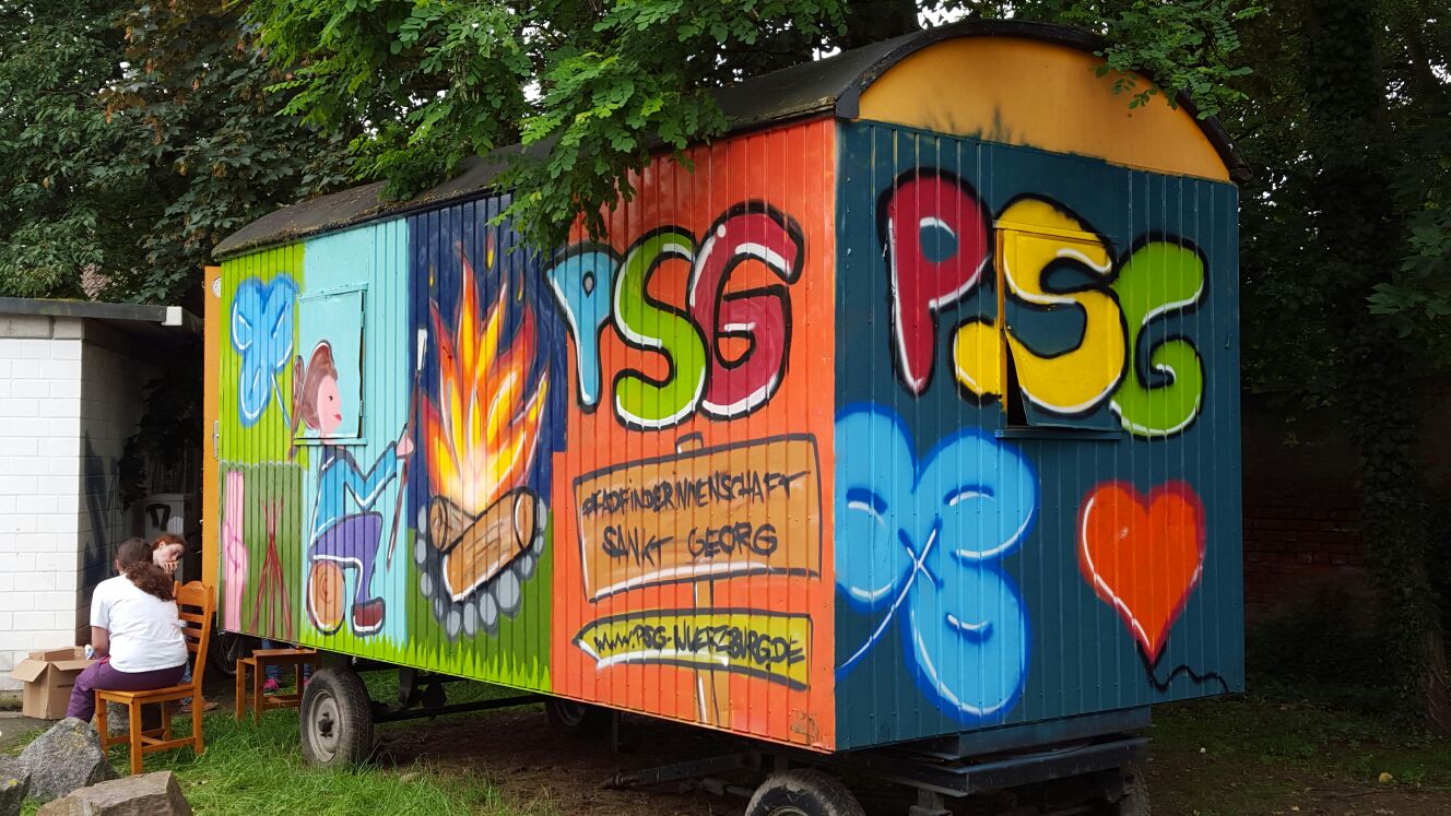 Den Bauwagen an der Ruth-Weiss-Realschule zu verschönern und auch von außen als Pfadfinderinnen-Treffpunkt erkennbar zu machen, das war das Ziel der Pfadfinderinnen der Pfadfinderinnenschaft St. Georg (PSG) beim Graffiti day am 14. Juni.