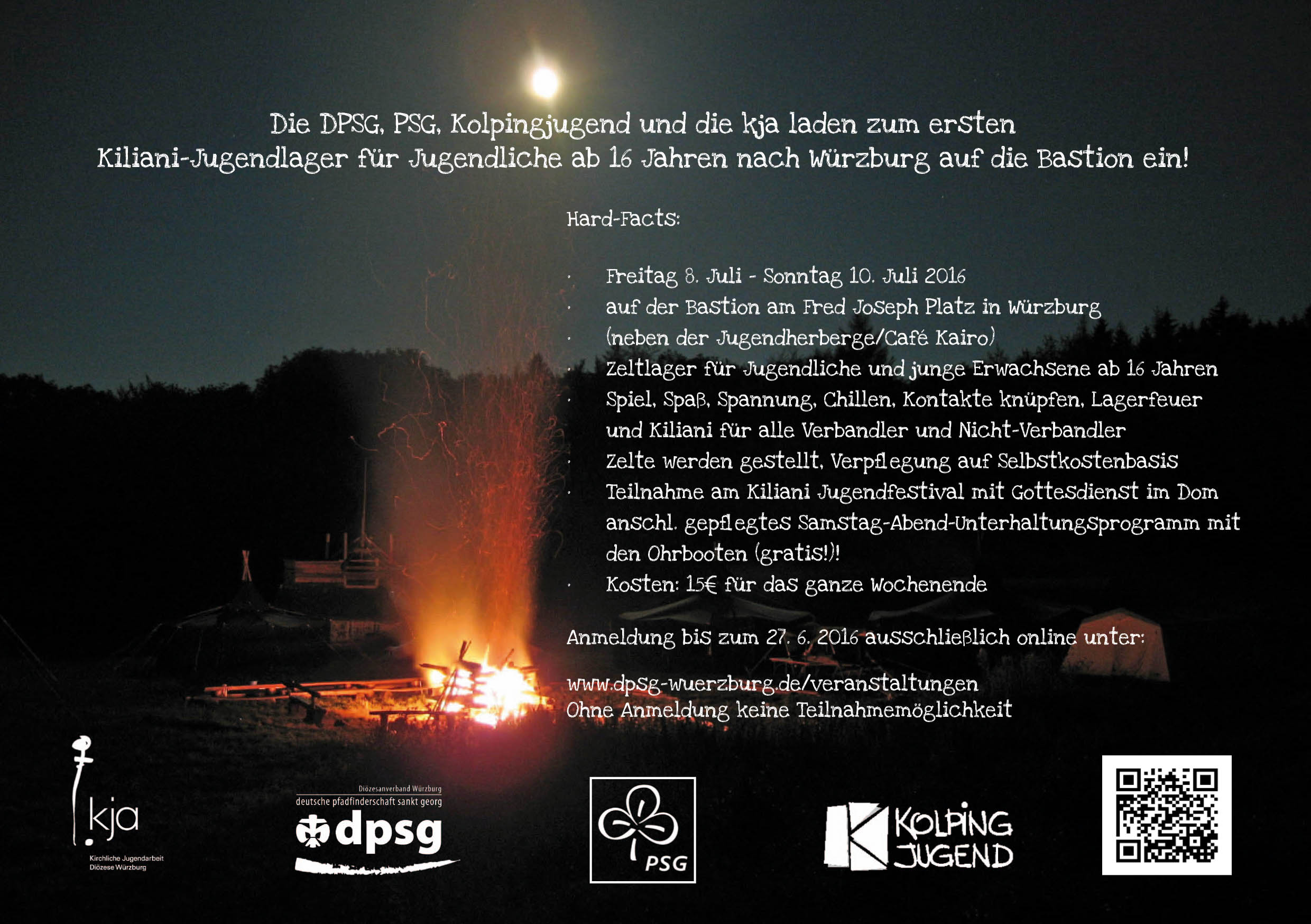 Am Sa, den 9. Juli findet dies Jahr wieder der Kiliani – Tag der Jugend statt. Aus diesem Anlass haben wir uns ein ganz besonderes Highlight für euch überlegt. Ihr seid herzlich eingeladen zu einem ganzen Kiliani-Wochenende –> 8. bis 10. Juli. Wir werden gemeinsam mit der dpsg, Kolping und anderen Jugendlichen auf der Bastion am Fred-Joseph Platz in Würzburg zelten. Ihr dürft gespannt sein auf ein besonderes Flair, einen tollen Kiliani-Tag und viel Spaß und Action mit Freunden und neuen Leuten.