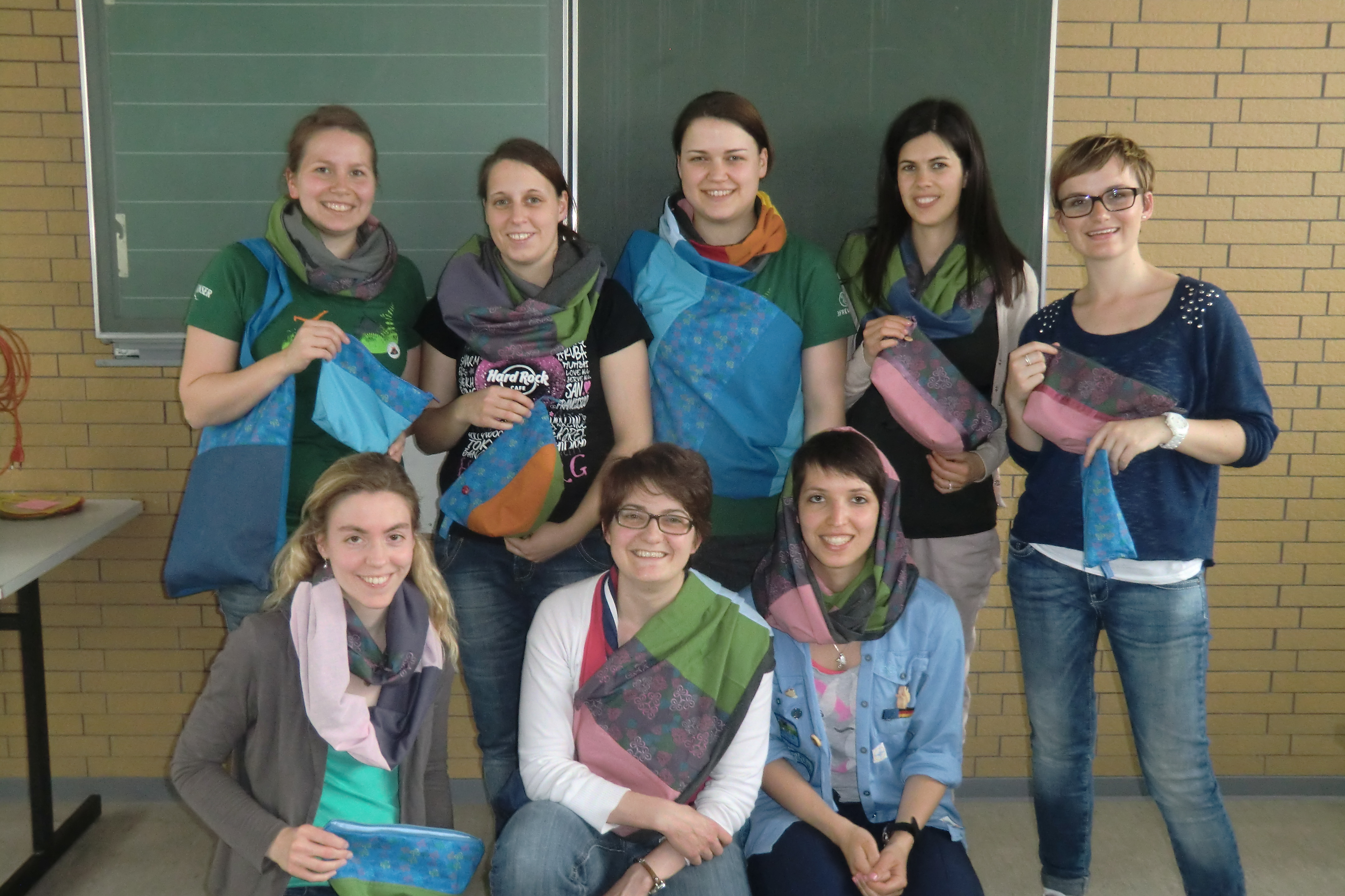 So hat sich eine Gruppe von Begeisterten getroffen und, egal ob erfahrene Näherin oder blutige Anfängerin, einen Tag lang die Maschinen rattern lassen. Mit viel Spaß suchten sich die Teilnehmerinnen passende Stoffe aus und überlegten sich, was sie nähen wollten. Ob blau, grün, gelb oder rosa – alle Farben passen zu den PSG-Stoffen und so waren der Phantasie keine Grenzen gesetzt. Es entstanden wunderschöne Loop-Schals, hübsche Kosmetiktäschchen und Einkaufstaschen. Wer mal nicht weiter wusste, zum Beispiel wie man nun diesen Loop-Schal umdrehen soll, bevor man ihn zusammennäht, wurde sofort von den beiden fachkundigen Referentinnen Judith und Ulli unterstützt.