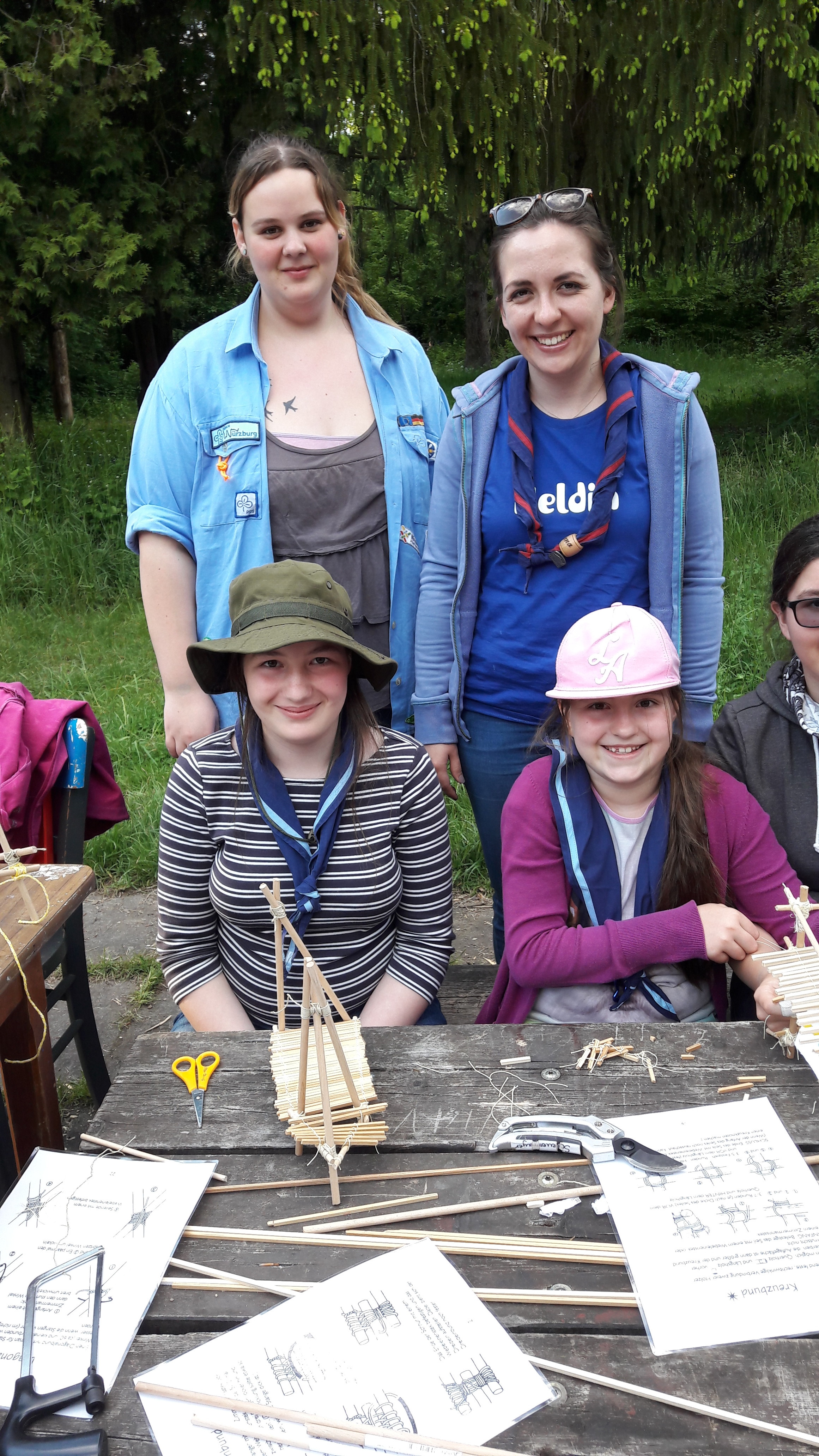 Bei der Fertigung von Mini-Lagerbauten kamen die Bastlerinnen voll auf ihre Kosten. Sowohl der sichere Einsatz von Säge und Gartenschere, als auch die Anwendung von Knoten wie dem Kreuzbund waren hierbei wichtig. So entstanden viele schöne Dreibeine mit Bannermast und weitere Bauten im Kleinformat.