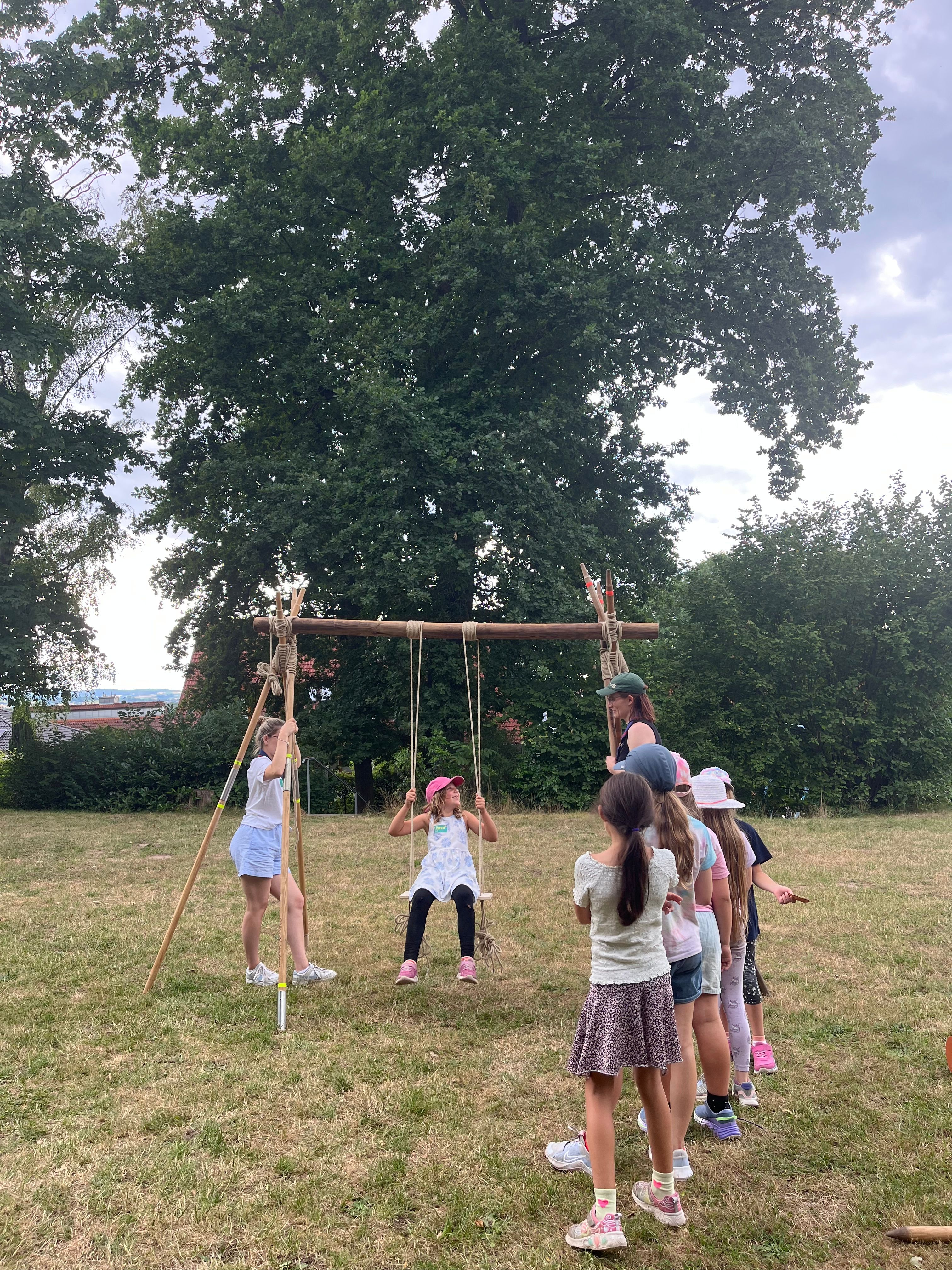 In einem Workshop lernten sie verschiedene Knoten kennen – vom einfachen Kreuzknoten bis hin zum Mastwurf. Dieses Wissen konnten sie direkt anwenden, indem sie gemeinsam eine Schaukel gebaut haben. Die fertige Konstruktion wurde anschließend natürlich ausgiebig getestet – ein echtes Highlight für Alle!