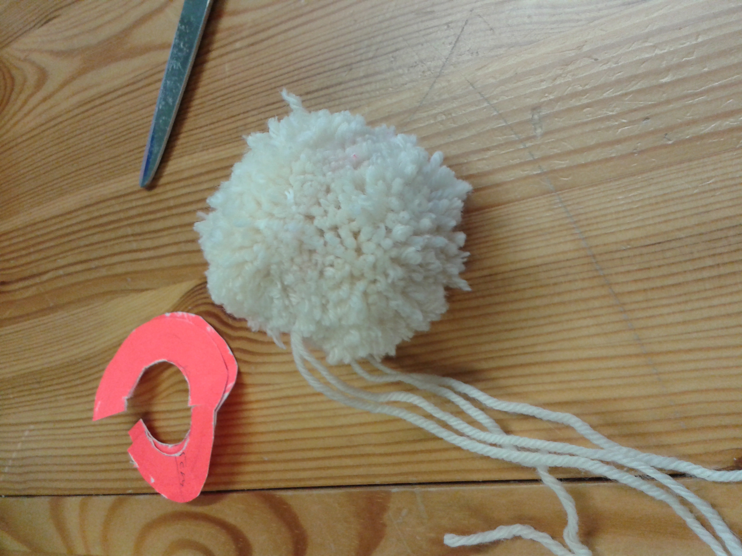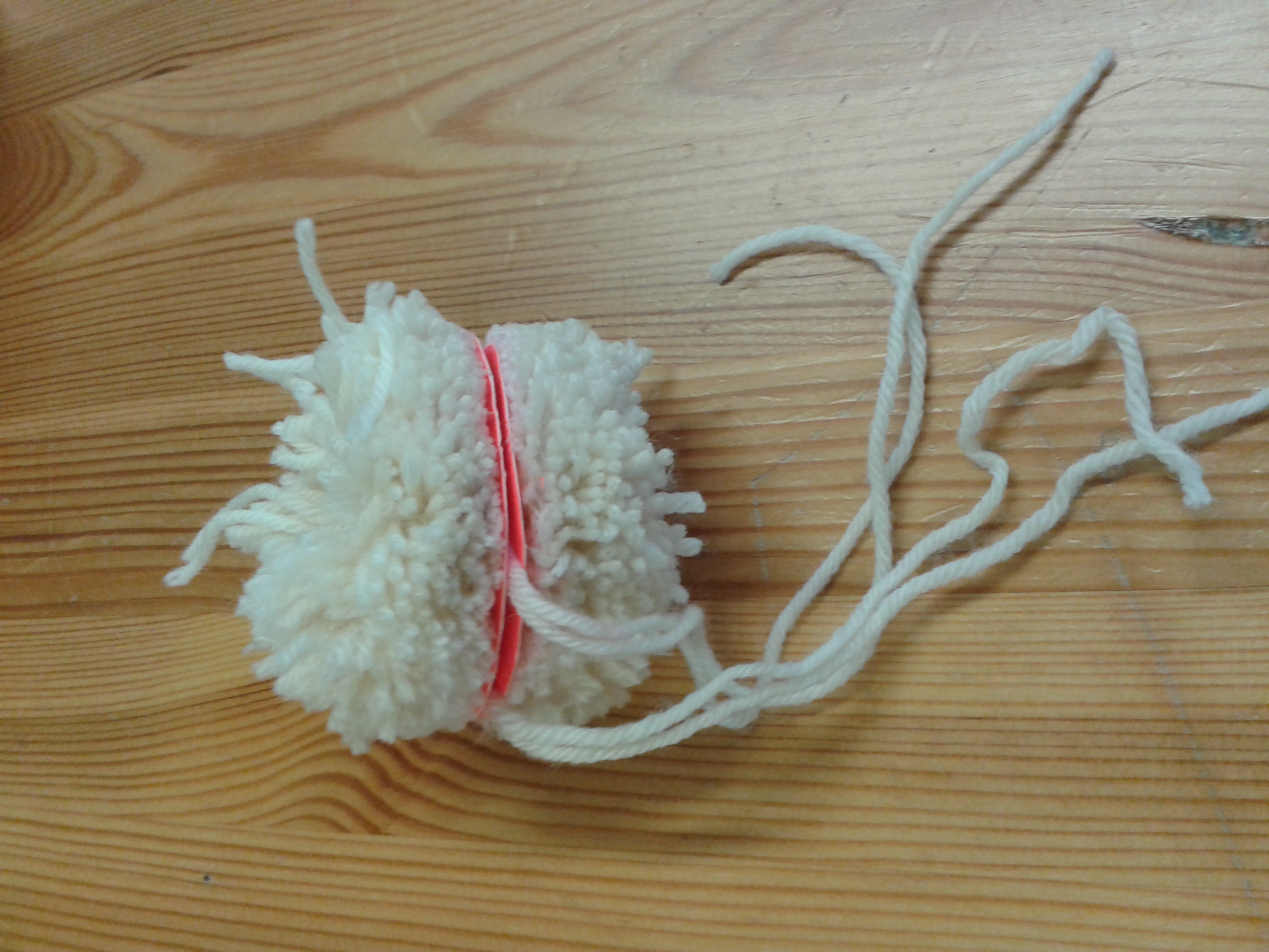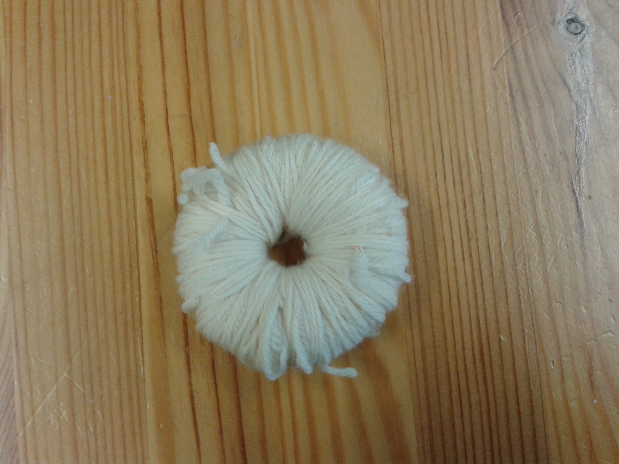 Jetzt schneidet ihr von der Wolle 4-8 Fäden mit einer Länge von ungefähr 2m ab. Legt dann die beiden Pappringe übereinander und wickelt den Faden um den äußeren Kreis. Das Wollende müsst ihr dabei festhalten, bis ihr einmal rum seid und die Wolle sich gegenseitig hält.