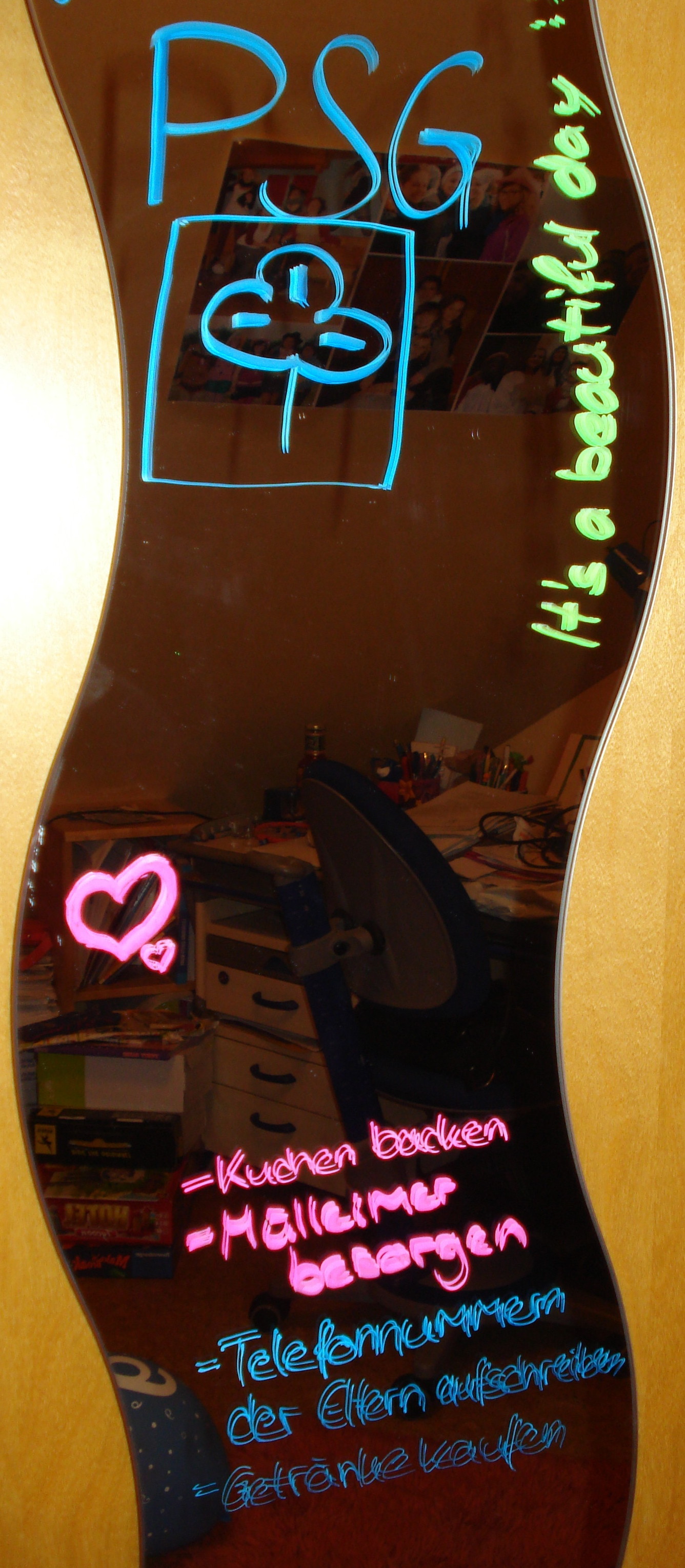 Und falls ihr keine Spiegelfolie bekommt, könnt ihr euch auch überlegen, einen normalen Spiegel zu kaufen, auch unangemalt verschönert er bestimmt euren Gruppenraum. Oder Tafelfolie (auch z.B. bei Opitec erhältlich: http://de.opitec.com/opitec-web/c/zz/cID/c3I6dGFmZWxmb2xpZTE=/searchResult.jsf) für die Wand oder Tür ist auch immer ziemlich cool und man kann sie auch gut als Pinnwand nutzen oder sie einfach mit Kreide oder Kreide-Markern verzieren : )